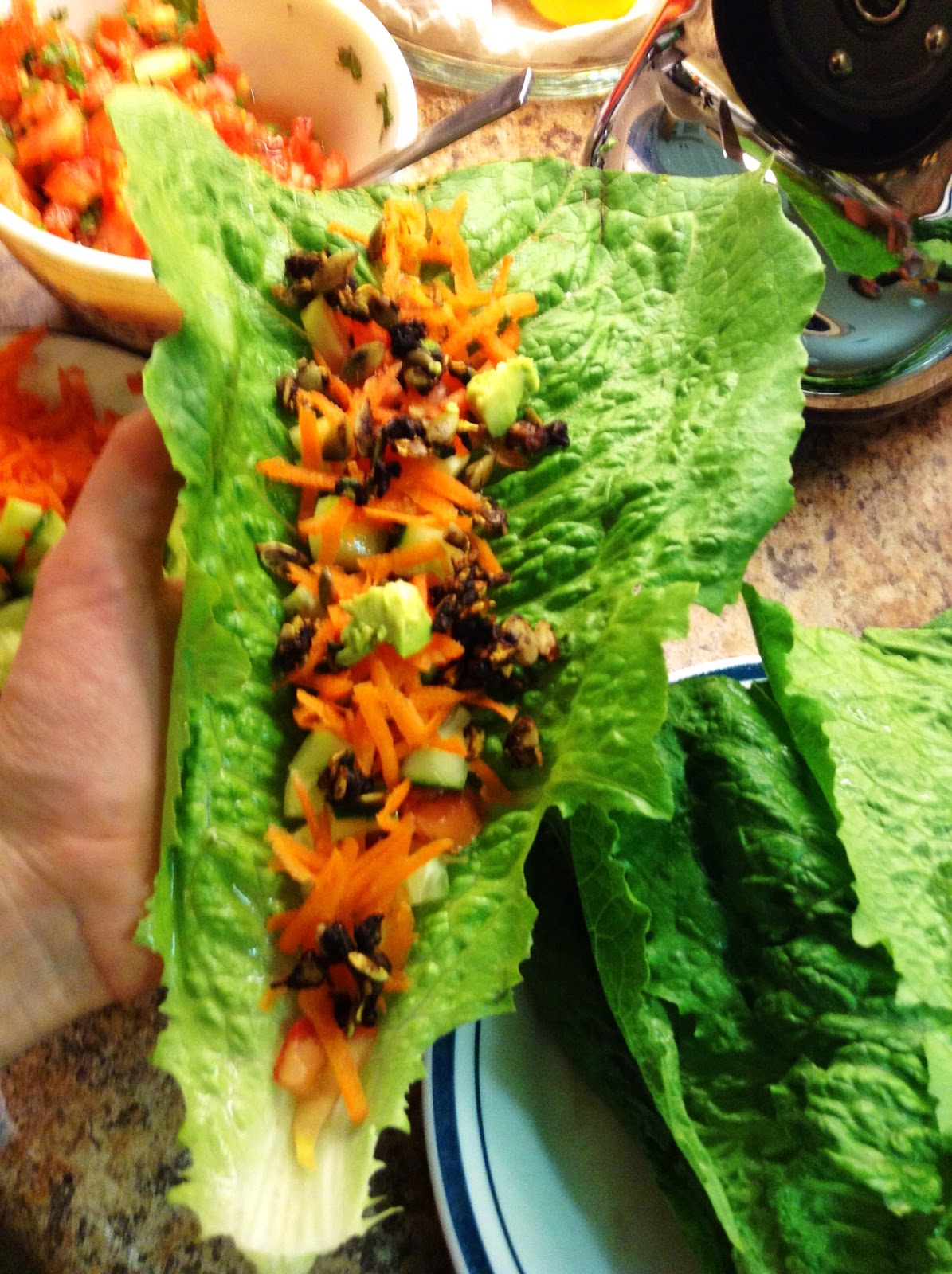 That's it! Now take your romaine taco shell, layer the "meat", cucumber pieces, salsa and "carrot cheeze" - this recipe is way up there on my favourite list! Give it a try!